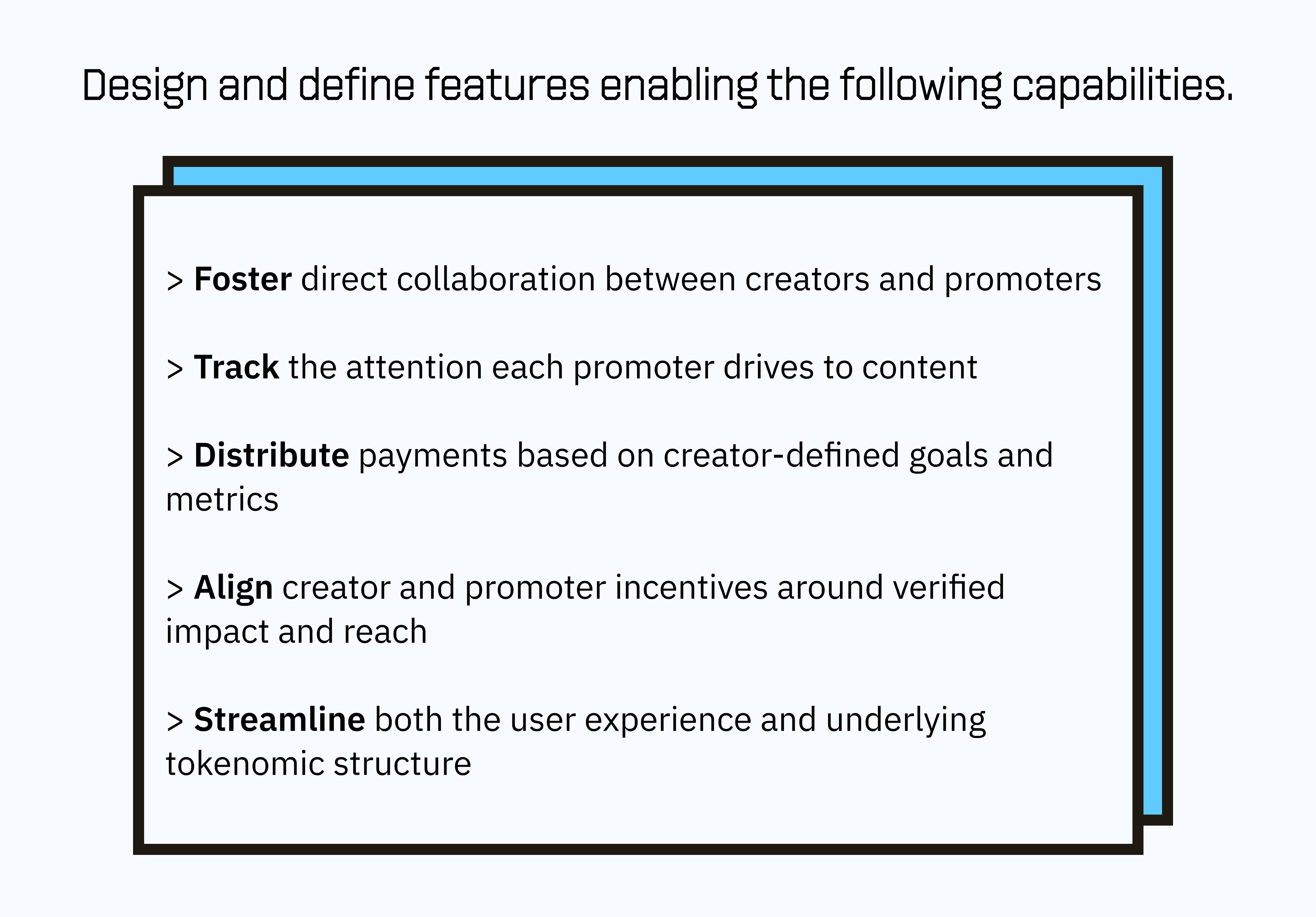 I broke down the task into 5 core requirements, iterating on each with multiple divergent solutions, rounds of user testing and rough prototypes. The features we built needed to shift the orbit of the typical online media economy from value extraction to outcome-alignment and value delivery.
